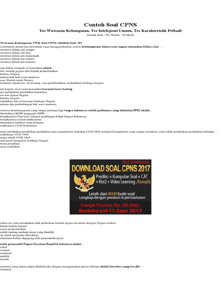 Soal tes seleksi kompentensi bidang ini. Batan adalah lembaga pemerintah non departemen, yang memiliki tugas di bidang penelitian, pengembangan dan pemanfaatan tenaga nuklir di indonesia: Yuk, download soal skb cpns terbaru dari arnaim.com. 50 contoh soal tes wawasan kebangsaan untuk cpns terbaru 40 contoh soal dan pembahasan tes karakteristik pribadi untuk cpns terbaru. Selalu aware dengan peristiwa kesehatan terbaru, karena biasanya itu akan dimunculkan dalam soal skb setiap tahun.